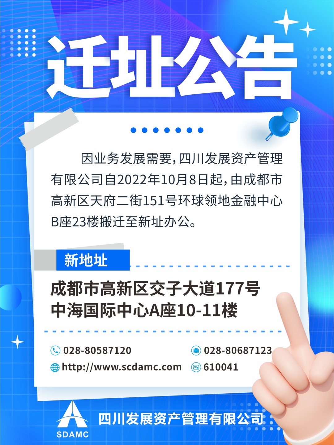 因業(yè)務(wù)發(fā)展需要,四川發(fā)展資產(chǎn)管理有限公司自2022年10月8日起,由成都市高新區(qū)天府二街151號(hào)環(huán)球領(lǐng)地金融中心B座23樓搬遷至新址辦公。